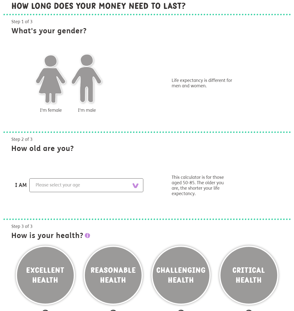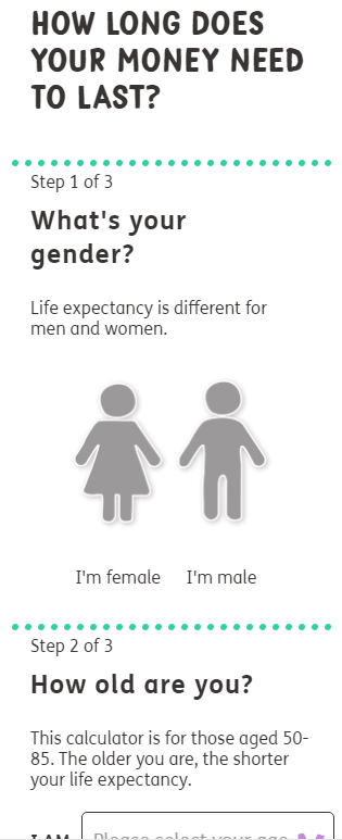 This calculator helps give an indication of the chances of living to certain ages. It's based on your own assessment of your general health and UK pensions industry data (The Continuous Mortality Investigation 2017).
