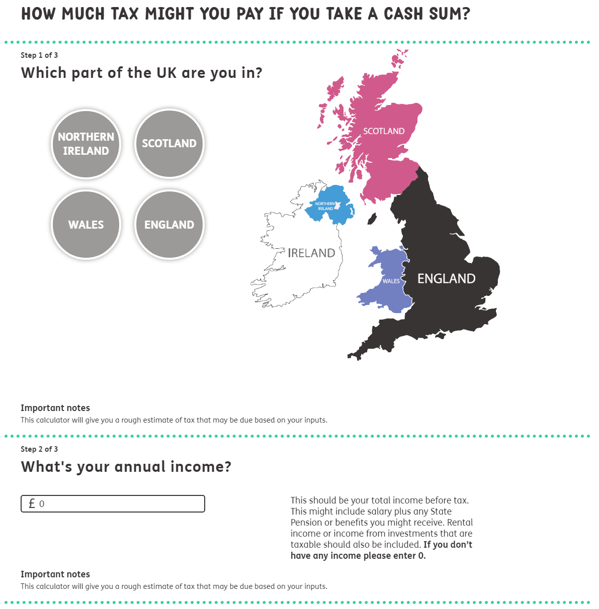 Our pension tax calculator looks at how much you will have earned in the current tax year and determines how much tax is likely to be due, should you choose to take a one off payment from your pension.